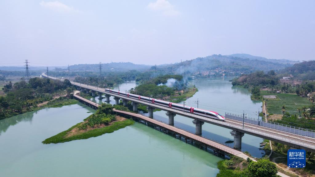 這是2023年9月30日在印度尼西亞普哇加達拍攝的一列行駛中的雅萬(wàn)高鐵高速動(dòng)車(chē)組(無(wú)人機照片)。雅萬(wàn)高鐵是印尼和東南亞第一條高速鐵路,是中印尼兩國高度關(guān)注的共建“一帶一路”旗艦項目。