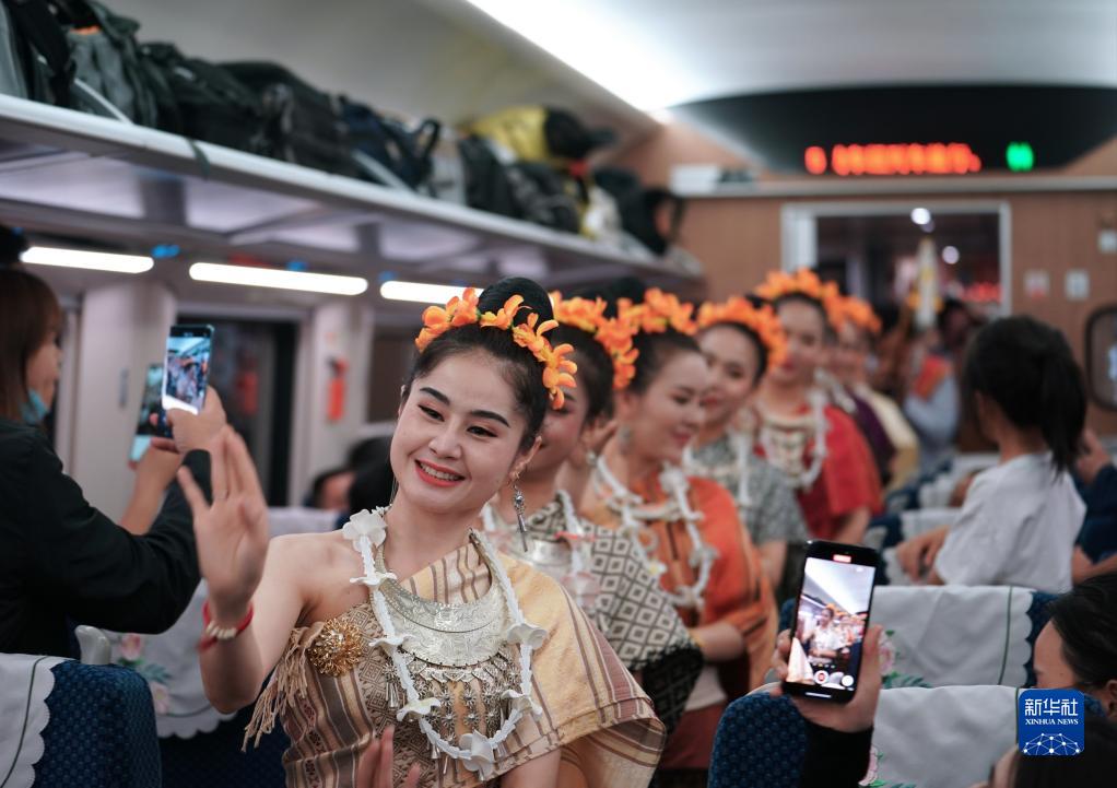 2023年4月13日,老撾工作人員在D887次國際旅客列車(chē)上表演。北起中國昆明,南至老撾萬(wàn)象,全長(cháng)1035公里的中老鐵路跨越山河,促進(jìn)了中老兩國以及共建“一帶一路”國家間的經(jīng)貿合作和文化交流,成為聯(lián)通內外、輻射周邊、雙向互濟的黃金大通道。