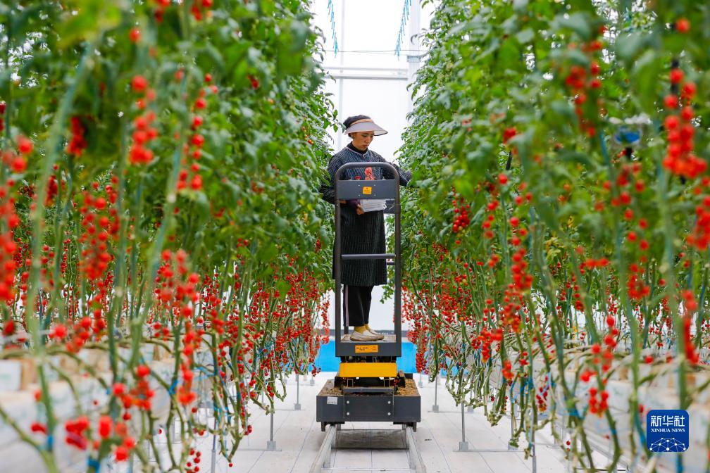 10月13日,在理塘縣瑪吉阿米花園農莊的智慧農業(yè)無(wú)土栽培館,當地藏族群眾柔吉采摘紅色小番茄。