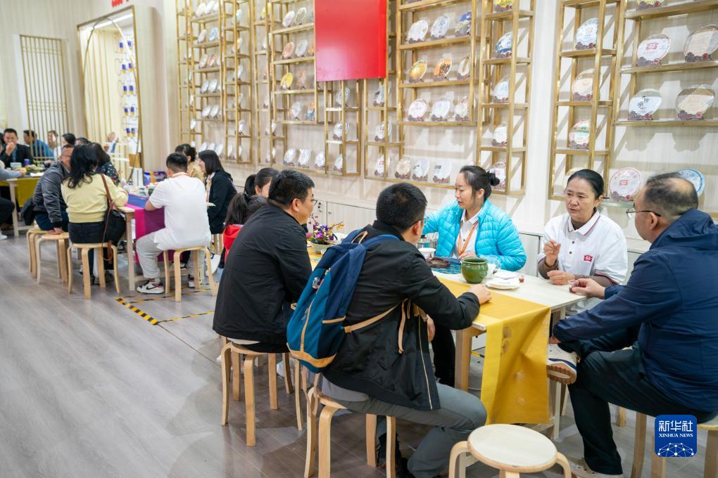 10月14日,參觀(guān)者在第十五屆中國云南普洱茶國際博覽交易會(huì )上品茶交流。