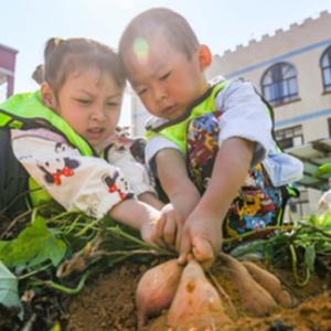 10月16日,湖南省永州市道縣城東幼兒園的小朋友在體驗采收紅薯。
