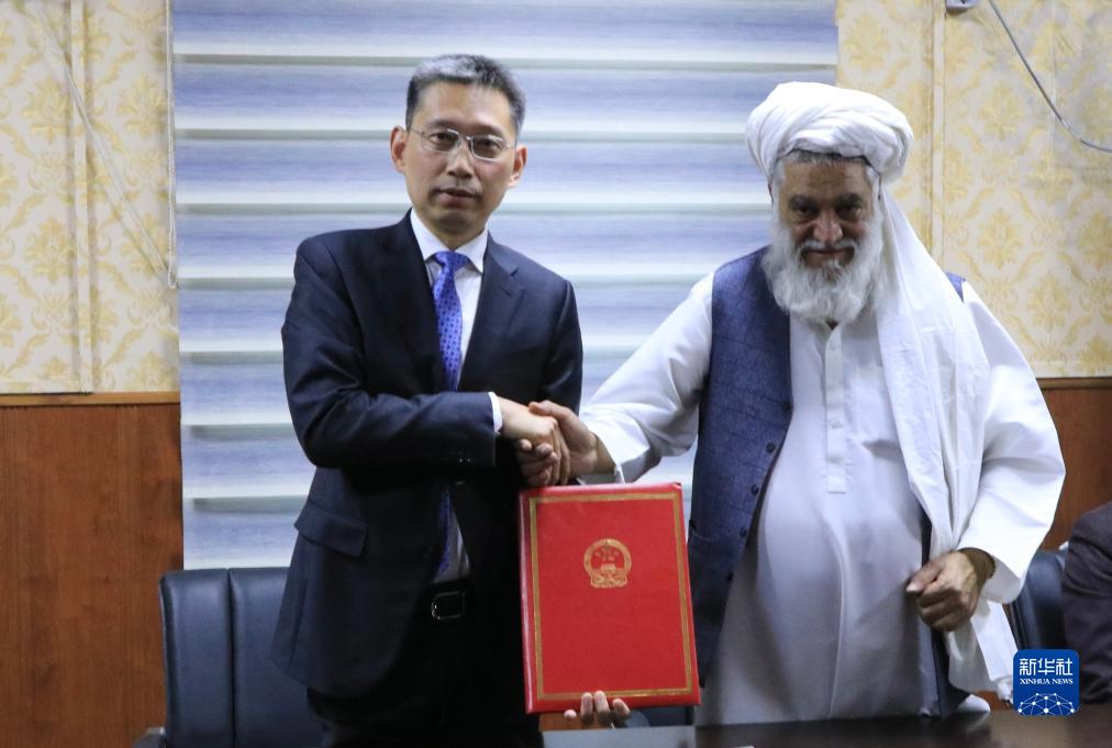 10月15日,在阿富汗首都喀布爾,中國駐阿富汗大使趙星(左)與阿臨時(shí)政府災難管理部代理部長(cháng)阿洪德簽署中國政府和中國紅十字會(huì )援阿物資交接證書(shū)后握手。