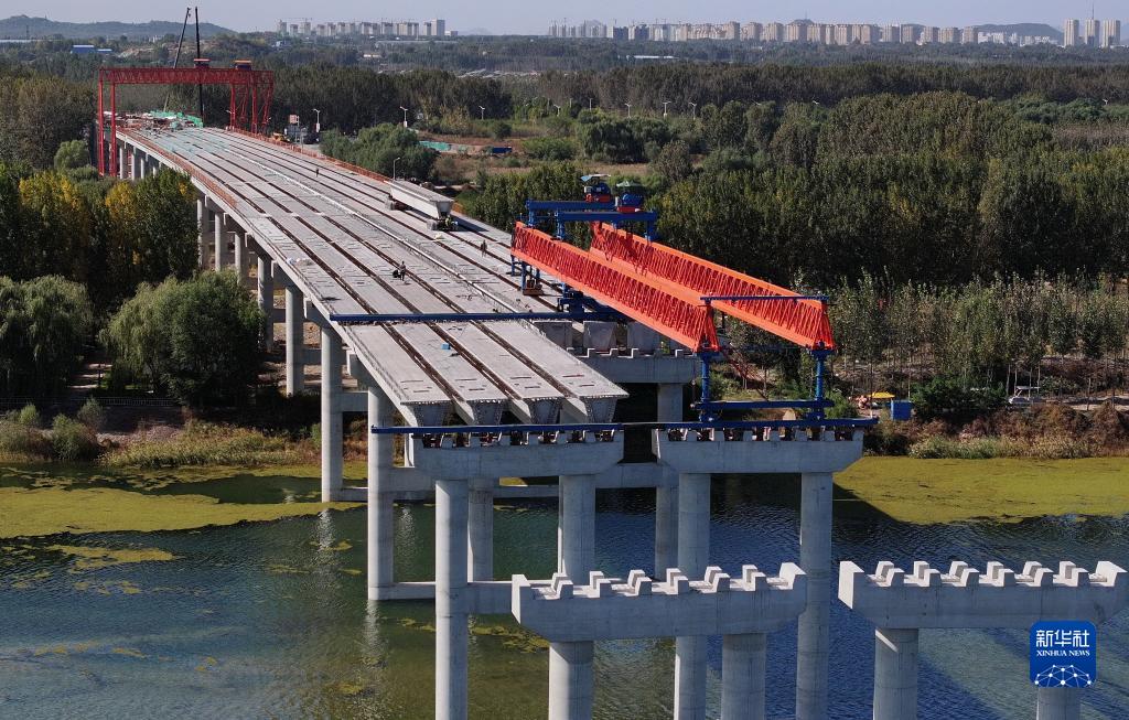 10月17日,工人在唐山灤州市內的秦唐高速公路跨灤河大橋建設工地施工(無(wú)人機照片)。