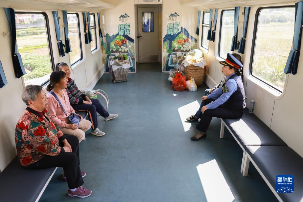 10月17日,5630次列車(chē)長(cháng)在車(chē)廂內和村民交流。