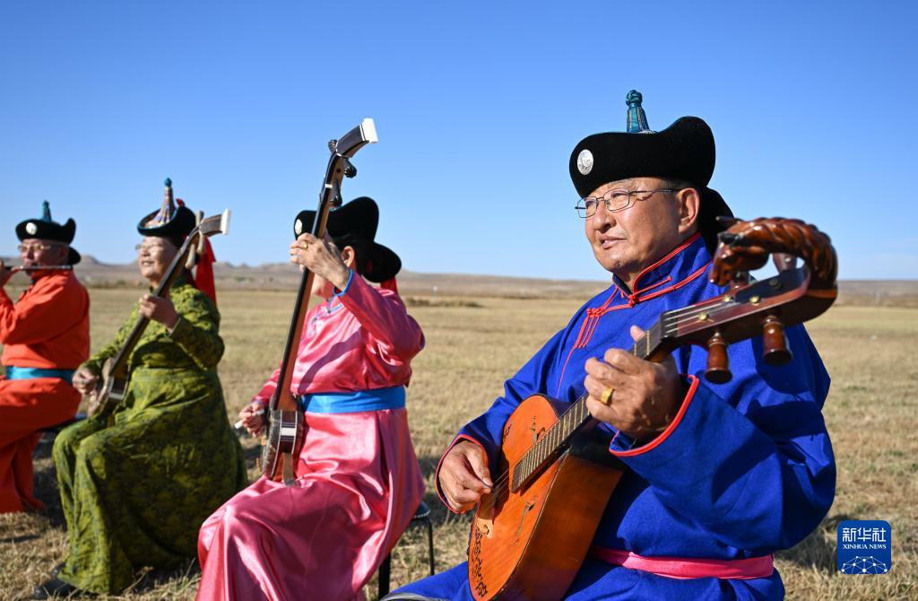 牧忙喂牛羊,閑時(shí)撫琴瑟。秋忙之余,道爾吉與父親明安寶會(huì )參加當地一項特色文藝活動(dòng)——“乃日”?!澳巳铡笨勺g為“禮樂(lè )”“娛樂(lè )”“聚會(huì )”,起源于元代,是一種以樂(lè )器歌舞為主的綜合性民間表演藝術(shù),被列入內蒙古自治區級非物質(zhì)文化遺產(chǎn)名錄。