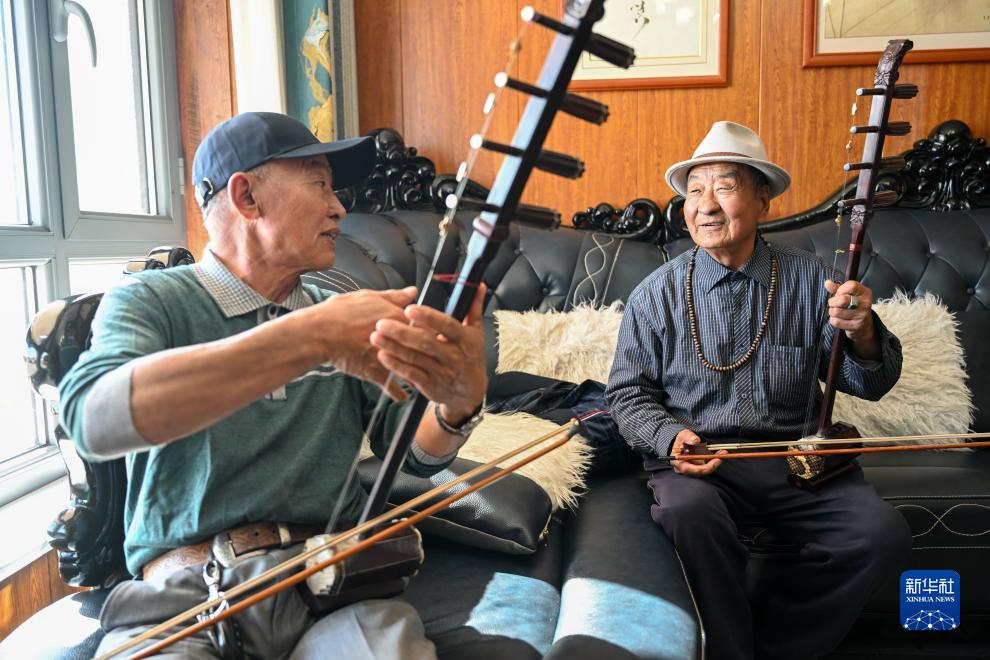 道爾吉的父親明安寶已經(jīng)91歲,曾經(jīng)是當地的鄉村醫生、鄉鎮衛生院院長(cháng)。2018年,明安寶組織周邊老人一同組建了老年人“乃日”樂(lè )隊,他們定期排練并參加各項演出活動(dòng),在傳承“乃日”文化的同時(shí),也豐富了牧區老年人的精神文化生活。明安寶說(shuō):“自從有了這個(gè)樂(lè )隊,我們有空就一起練習,比原來(lái)打麻將有意思多了。我以前通過(guò)看病治愈人們的身體,現在我們一起用‘乃日’文化‘治愈’大家的精神生活?!?/p>