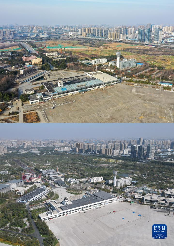 這是一張拼版照片:上圖為2021年2月9日拍攝的已停用的合肥駱崗機場(chǎng)(無(wú)人機照片,新華社發(fā) 黃洋洋攝);下圖為2023年10月17日拍攝的合肥駱崗公園(無(wú)人機照片,新華社記者周牧攝)。