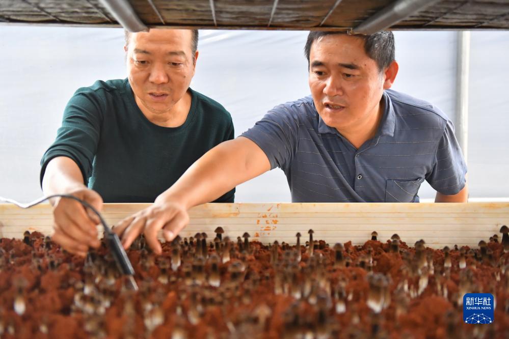 10月18日,在湘潭市雨湖區姜畬鎮泉塘子村,技術(shù)人員(左)在“5G智慧小菇房”指導村民在菇床上放置土壤濕度傳感器。