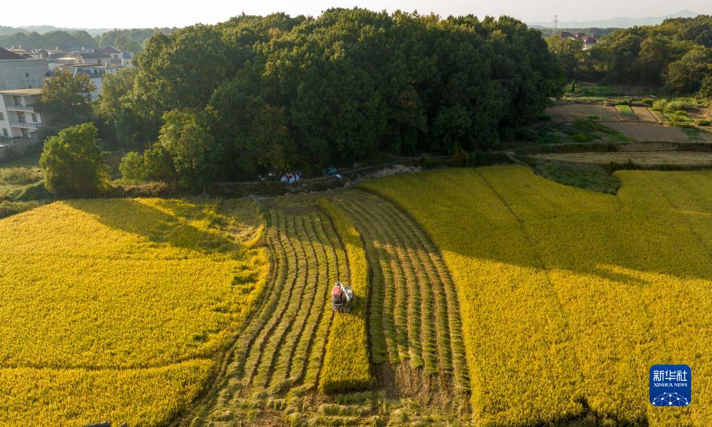 10月18日,在江西省九江市都昌縣汪墩鄉七星村,農民駕駛農機收割稻谷(無(wú)人機照片)。