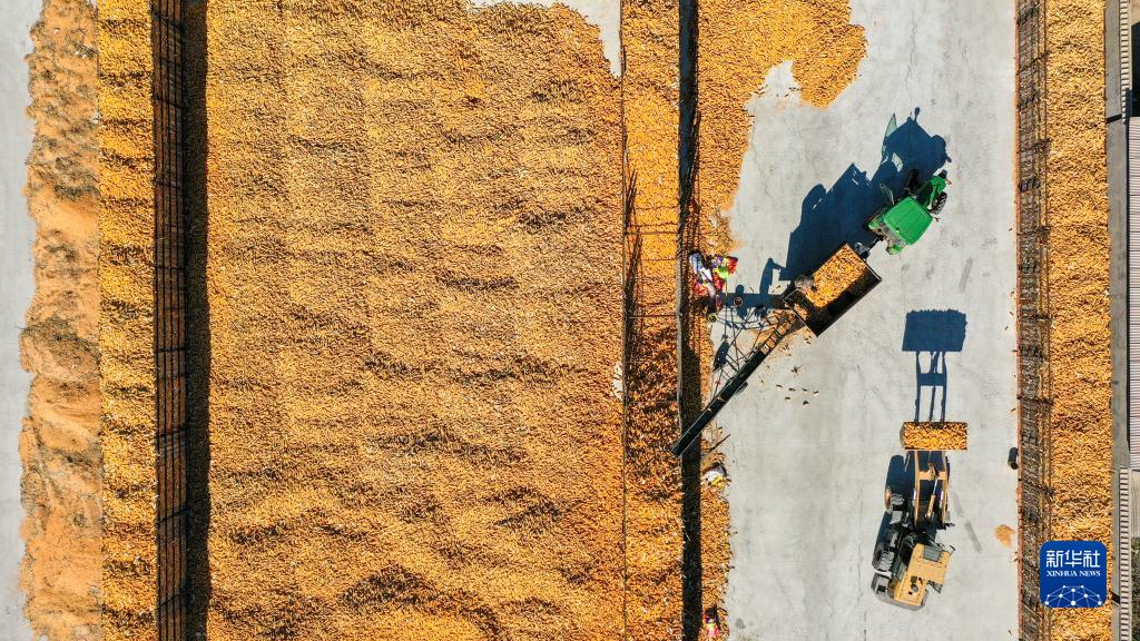 10月19日,在吉林省公主嶺市友忠種植農民專(zhuān)業(yè)合作社,農民將收獲的玉米放入科學(xué)儲糧倉(無(wú)人機照片)。