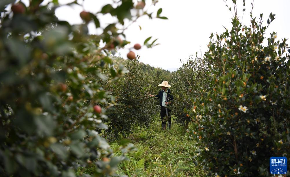 在乳源瑤族自治縣石角塘村的油茶省級現代農業(yè)產(chǎn)業(yè)園,工作人員查看油茶果長(cháng)勢(10月18日攝)。