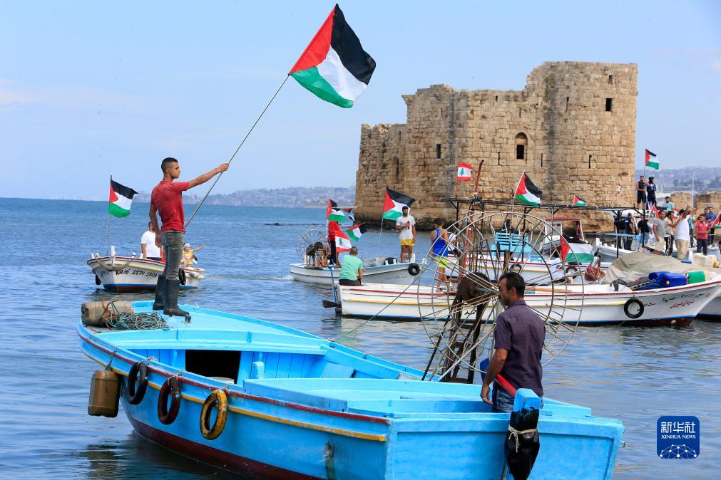 10月20日,在黎巴嫩南部西頓,漁民參加水上游行活動(dòng)。