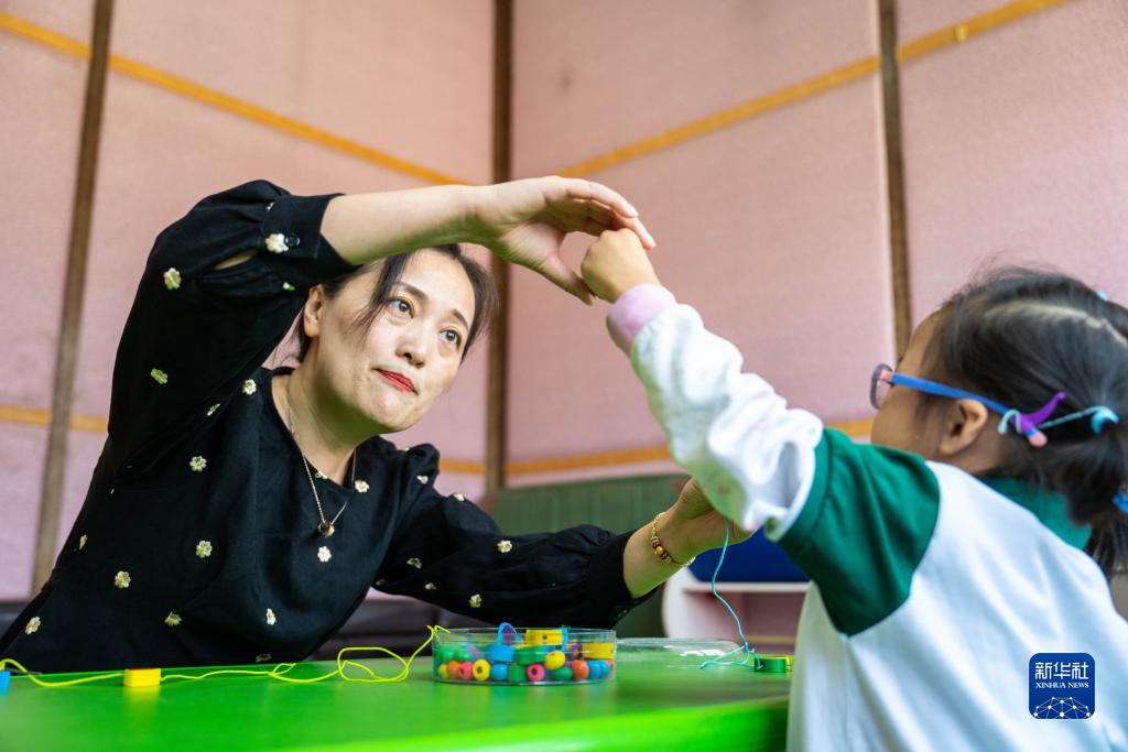 10月18日,常德市桃源特殊教育學(xué)校校長(cháng)彭敏在單訓室給學(xué)生做康復訓練。
