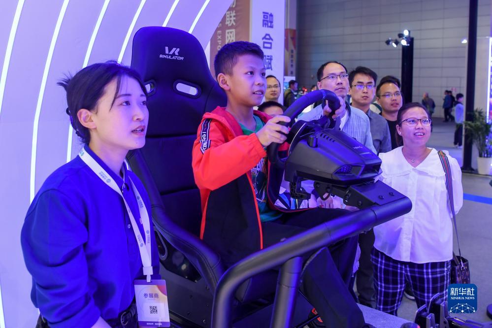 10月21日,小朋友在2023世界物聯(lián)網(wǎng)博覽會(huì )活動(dòng)現場(chǎng)體驗智能駕駛。