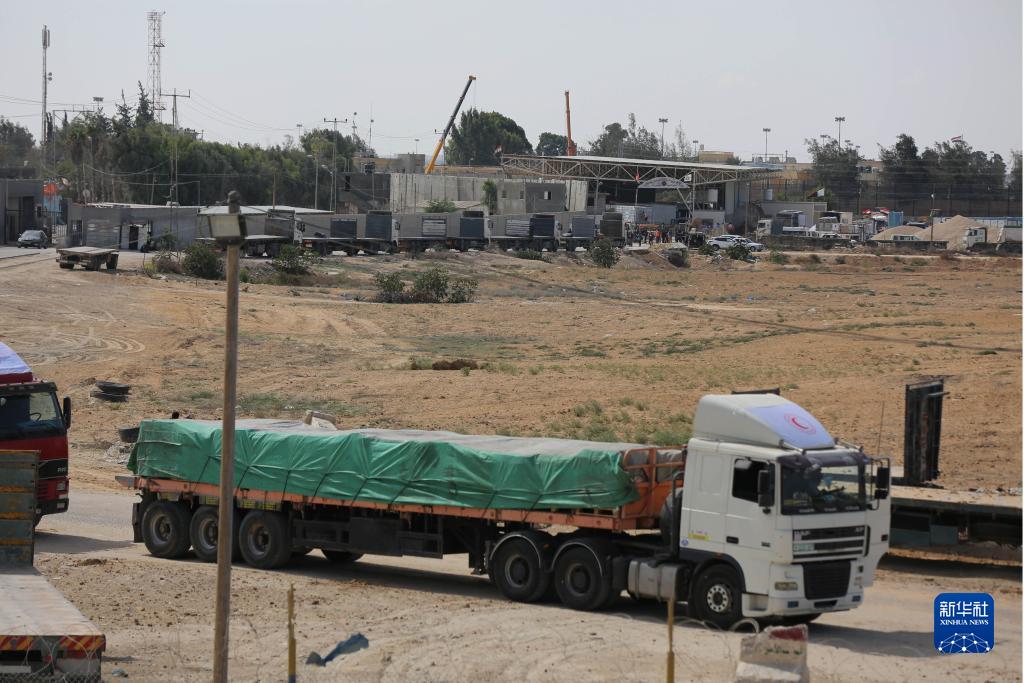 10月21日,裝載有人道援助物資的貨車(chē)通過(guò)拉法口岸進(jìn)入加沙地帶。