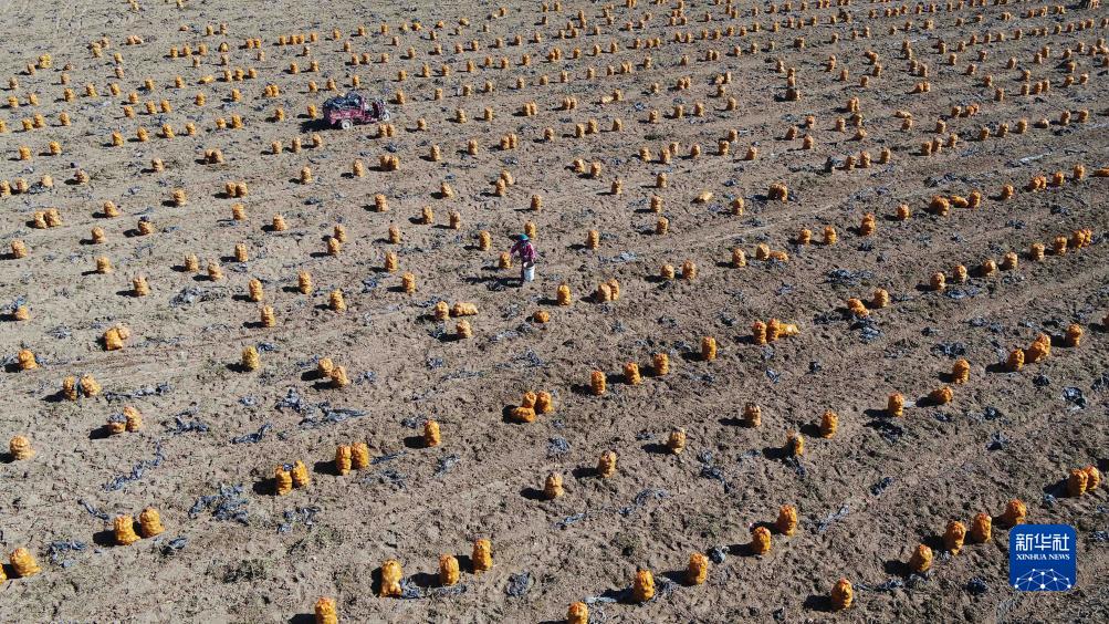 10月21日,農民在甘肅省定西市安定區魯家溝鎮馬鈴薯種植基地收獲馬鈴薯(無(wú)人機照片)。