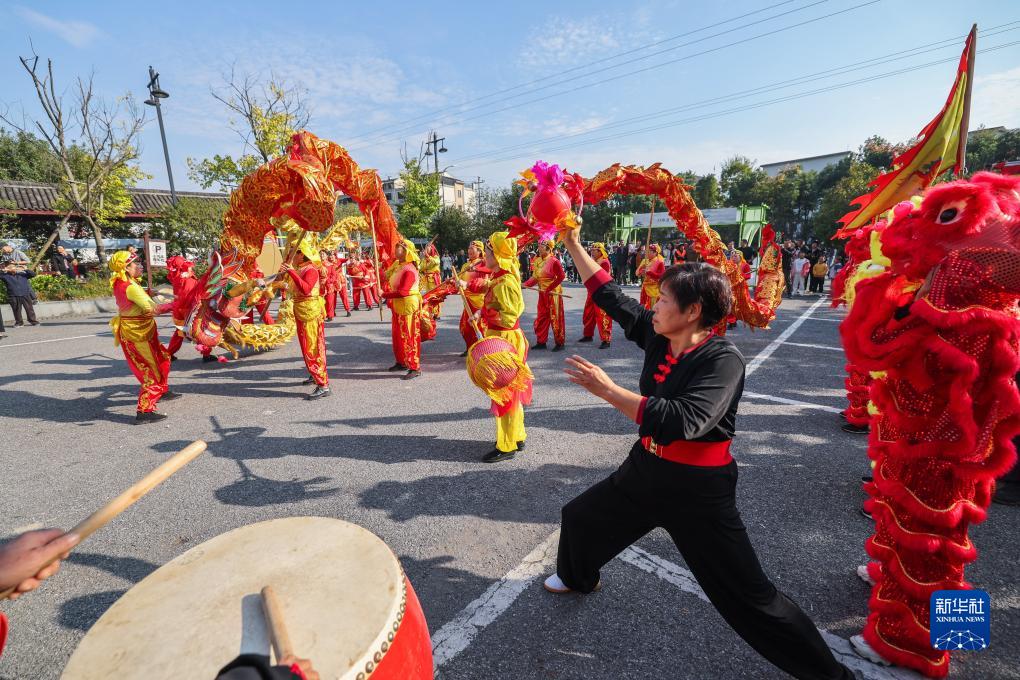 10月22日,香榧手工炒制大賽現場(chǎng)進(jìn)行傳統舞龍表演,慶祝香榧豐收。