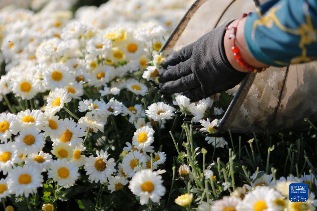 10月21日,在江蘇射陽(yáng)縣洋馬鎮,村民在采收菊花。