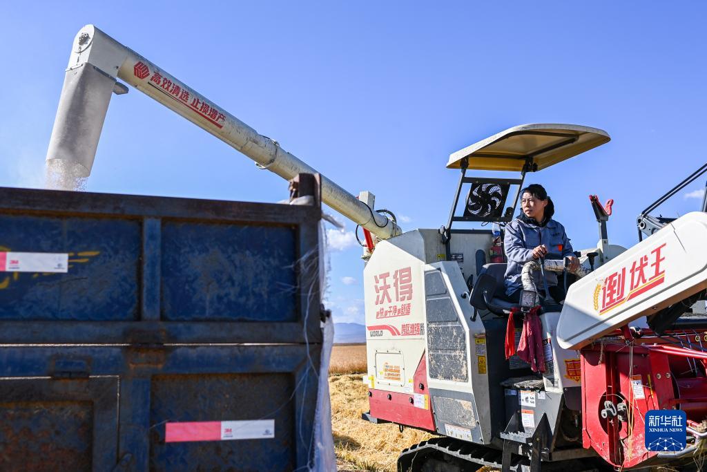 10月20日,劉春艷在琿春市三家子滿(mǎn)族鄉東崗子村的水稻田里駕駛收割機收割水稻。