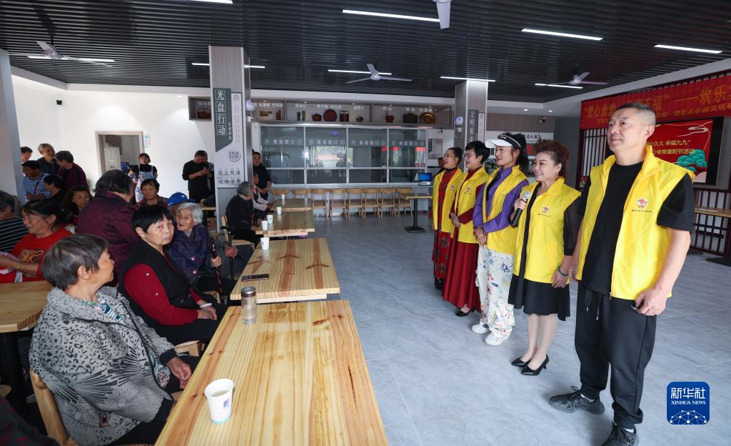 10月22日,在諸暨市楓橋鎮永安社區愛(ài)心食堂,志愿者在給老人們表演節目。