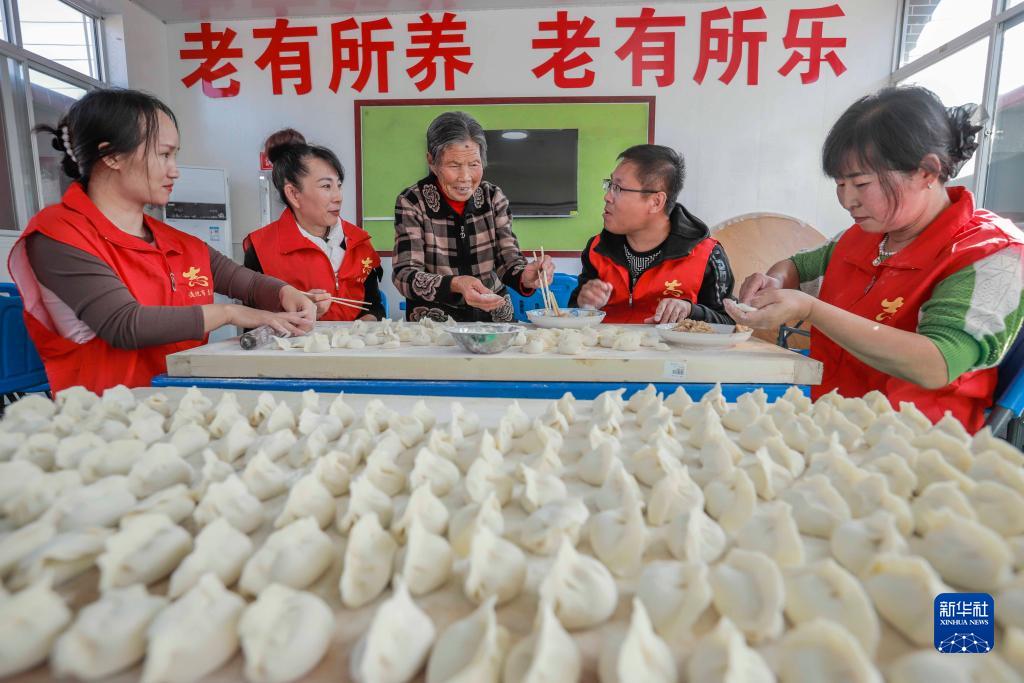 10月22日,志愿者在河北省遵化市東陵滿(mǎn)族鄉互助幸福院與老人一起包餃子。