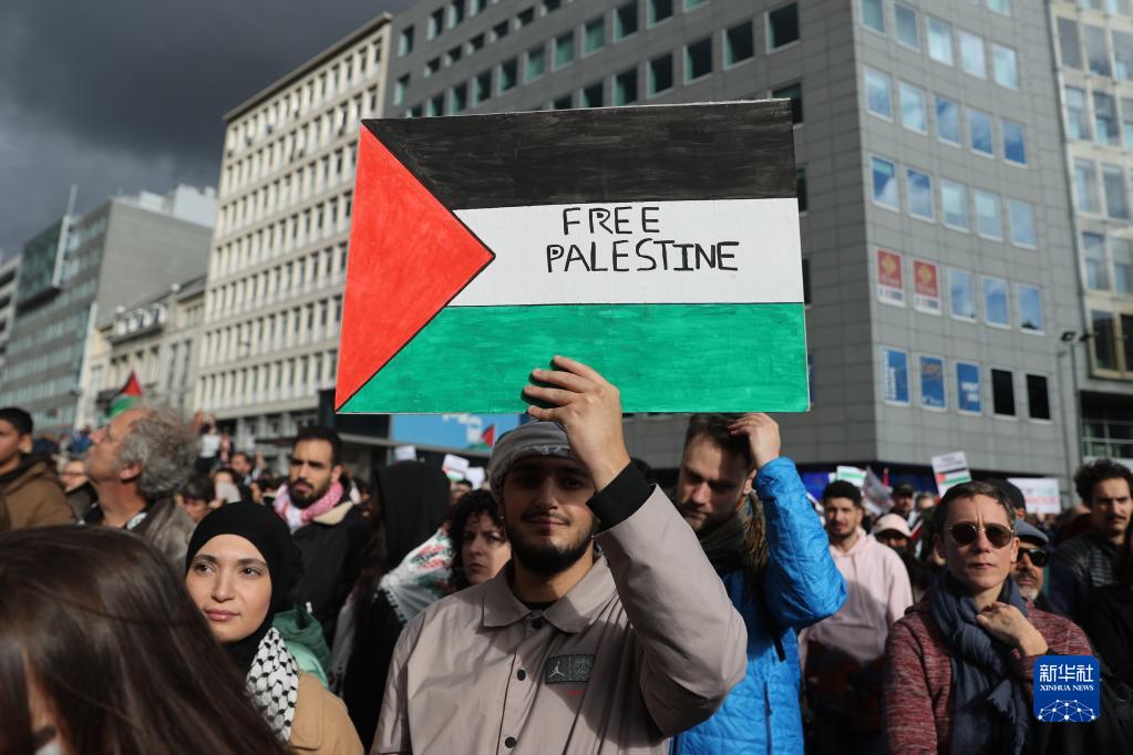 當日,眾多巴勒斯坦支持者在位于比利時(shí)布魯塞爾的歐盟總部附近舉行集會(huì ),聲援巴勒斯坦。