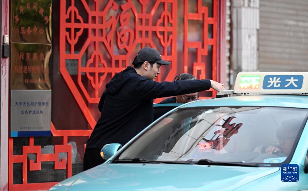 在靜雅老人院門(mén)口,陳卓照顧老人上車(chē)(10月21日攝)。