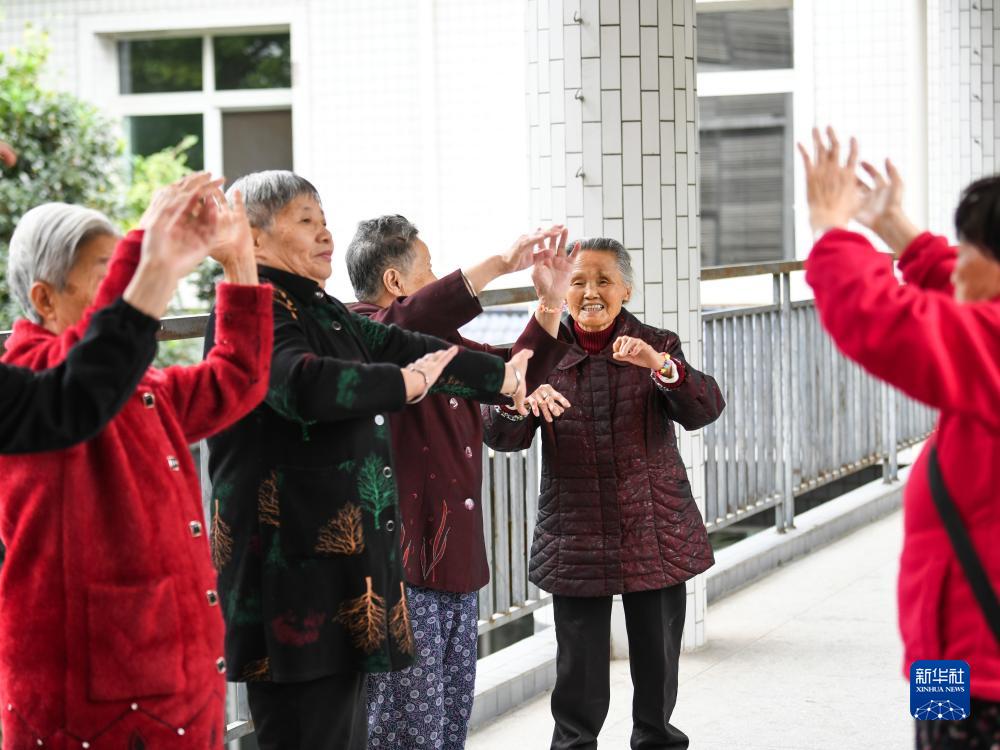 10月20日,在四川省眉山市彭山區社會(huì )福利院,趙鳳章老奶奶(右二)和福利院其他老人一起學(xué)做手指操。