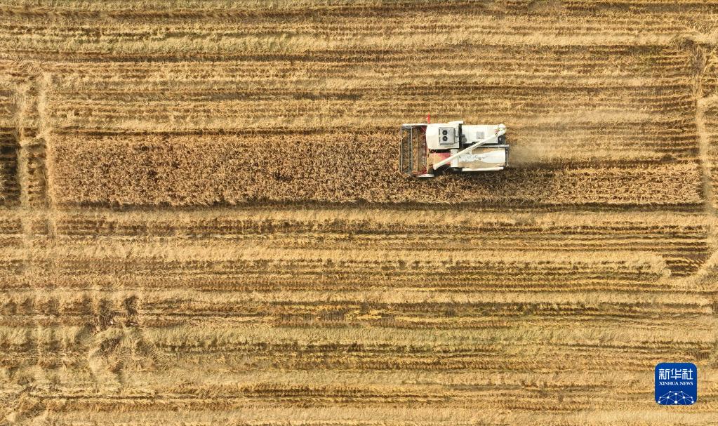 10月23日,水稻收割機在彰武縣大冷鎮上三家子村的稻田中收割水稻(無(wú)人機照片)。