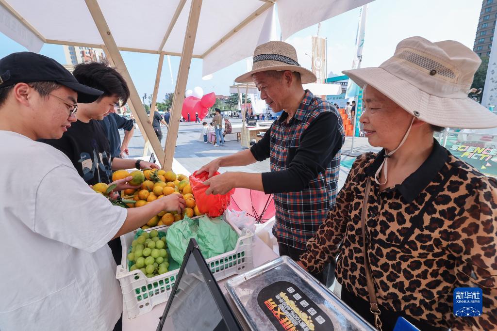 10月24日,游客在湖州市織里鎮豐收節現場(chǎng)的農特產(chǎn)品嘉年華集市上選購特色農產(chǎn)品。