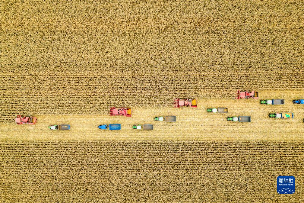10月18日,收割機在黑龍江省綏化市北林區張維鎮潤地農業(yè)種植合作社的一處玉米地收獲玉米(無(wú)人機照片)。