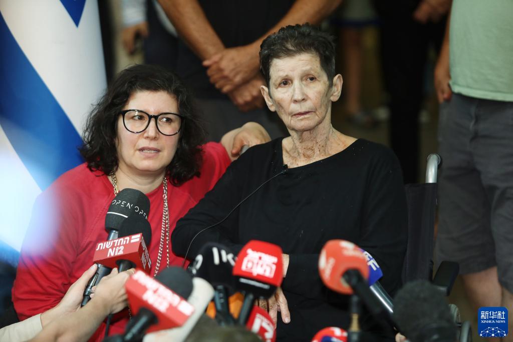 10月24日,獲釋的以色列被扣押人員約赫韋德· 利夫希茨(右)在以色列特拉維夫接受采訪(fǎng)。