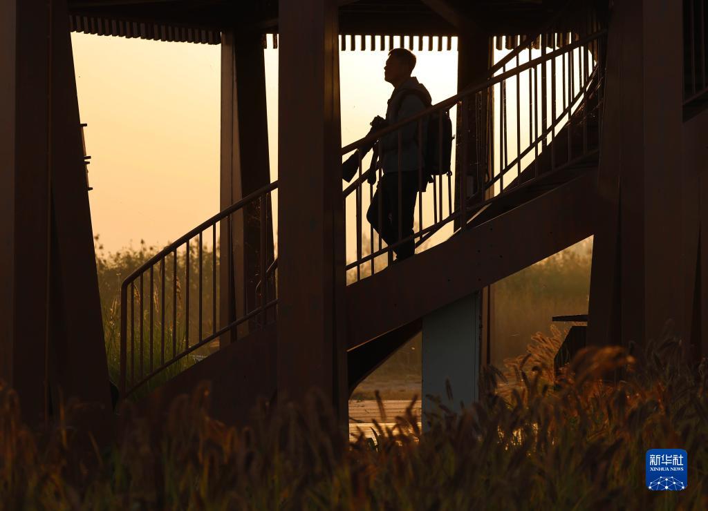 10月24日,韓戰橋在雄安新區孝義河河口濕地瞭望塔觀(guān)察野生鳥(niǎo)類(lèi)。