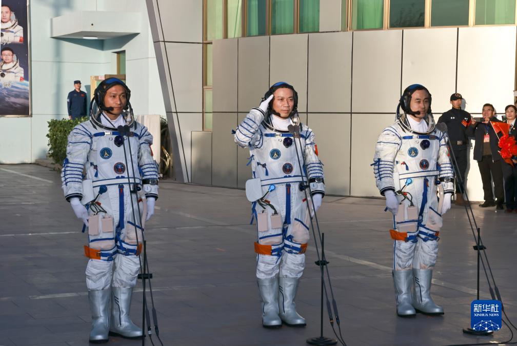 10月26日上午,神舟十七號載人飛行任務(wù)航天員乘組出征儀式在酒泉衛星發(fā)射中心問(wèn)天閣圓夢(mèng)園廣場(chǎng)舉行。這是航天員湯洪波(中)、唐勝杰(右)、江新林在出征儀式上。