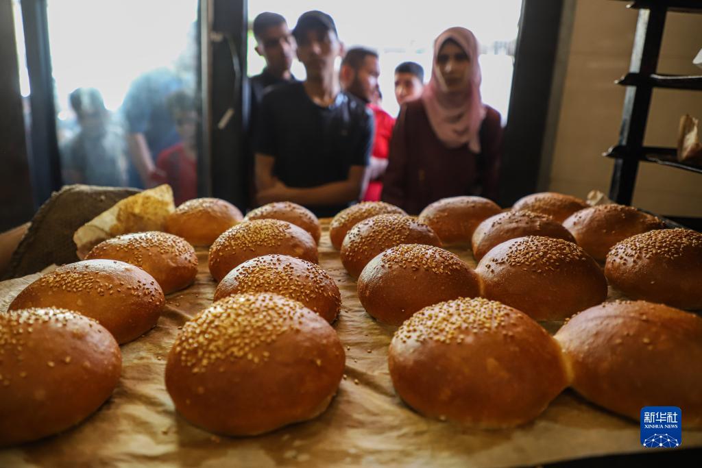 10月25日,在加沙地帶南部城市汗尤尼斯,人們在一家烘焙店外排隊購買(mǎi)面包。