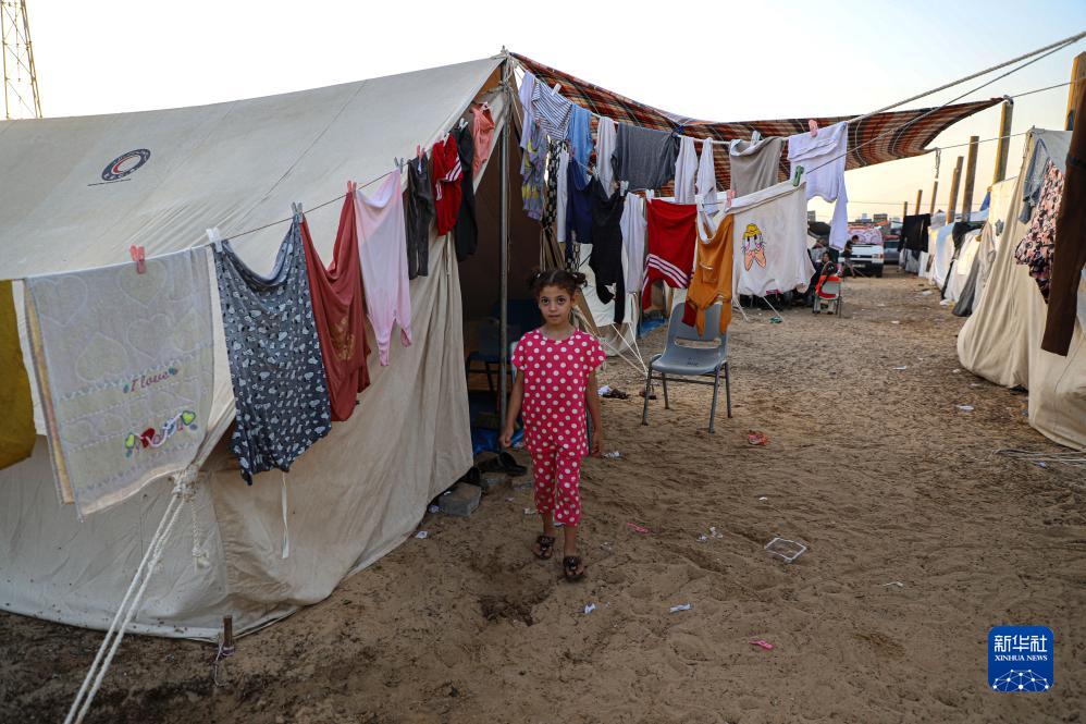 10月25日,兒童走在加沙地帶南部一處收容流離失所巴勒斯坦人的臨時(shí)營(yíng)地內。
