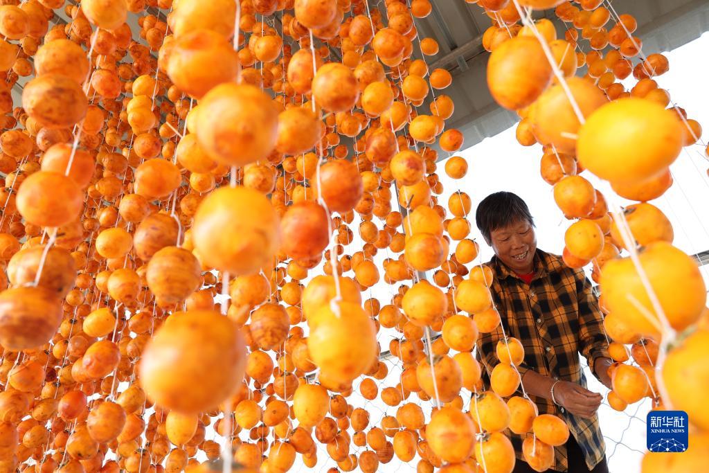 10月22日,村民在山東省棗莊市山亭區北莊鎮雙山澗村晾曬柿子。