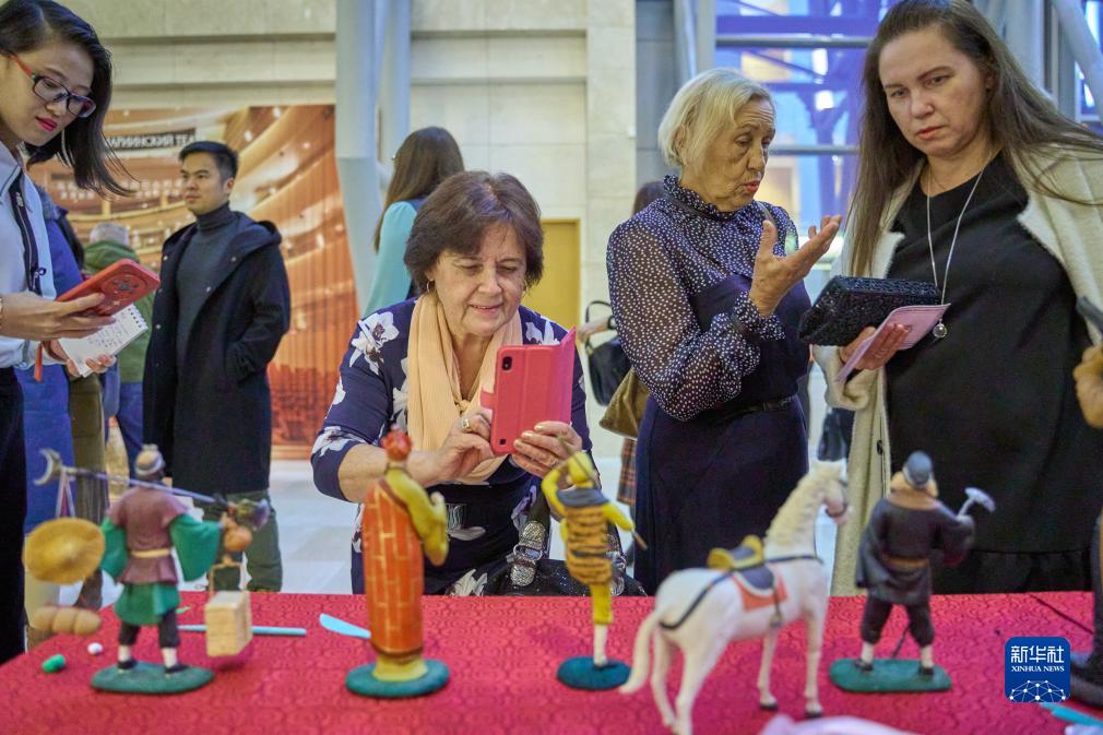 10月25日,在俄羅斯符拉迪沃斯托克,一名觀(guān)眾(中)拍攝面塑作品。