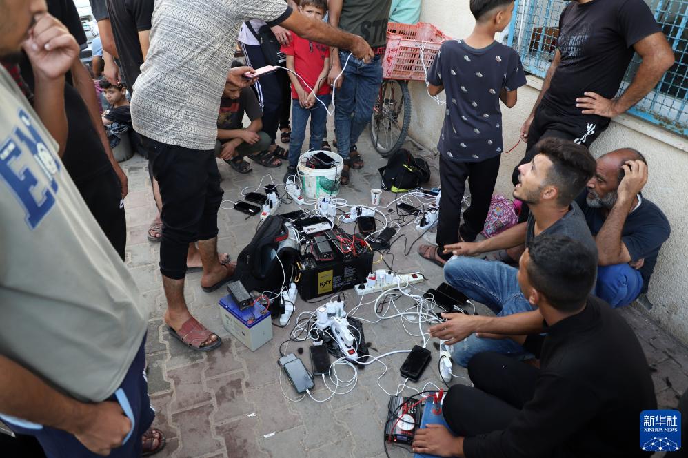 10月25日,在加沙地帶南部城市汗尤尼斯,人們在街頭給手機充電。