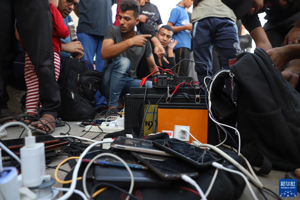 10月25日,在加沙地帶南部城市汗尤尼斯,人們在街頭給手機充電。