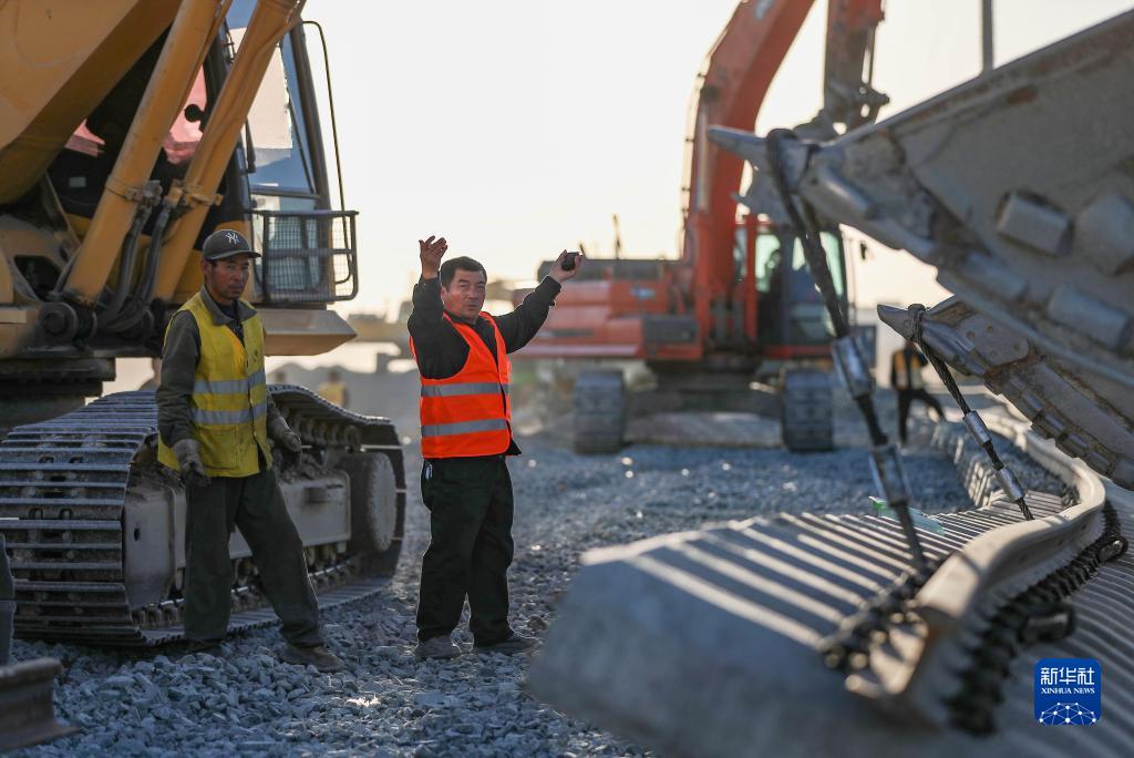 10月26日,施工人員在錦承線(xiàn)金溝站(不含)-朝陽(yáng)南站(不含)區間段轉正線(xiàn)改造封鎖施工現場(chǎng)引導施工機械作業(yè)。
