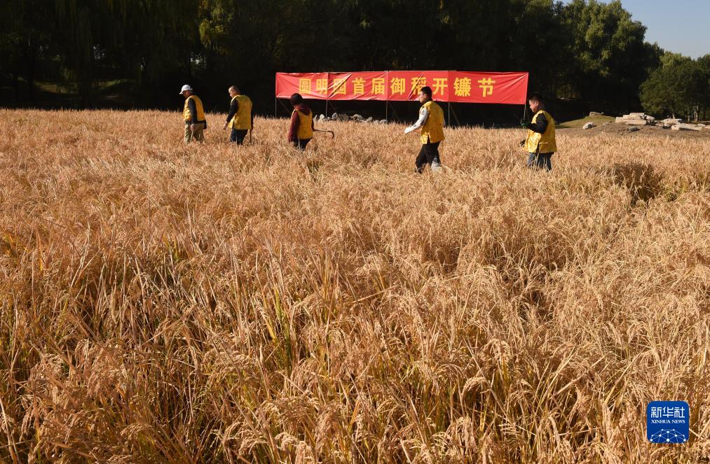 10月27日,工作人員進(jìn)入圓明園“多稼如云”景區稻田,準備開(kāi)鐮。