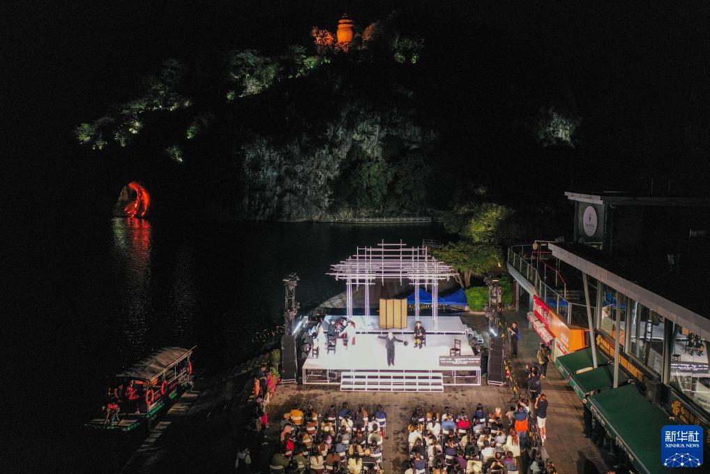 10月27日晚,在廣西桂林市象山公園,演員們在表演歌?。o(wú)人機照片)。