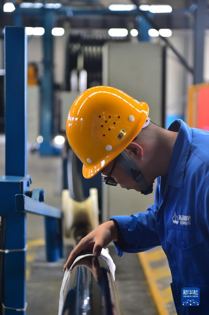 10月27日,在山東省聊城市陽(yáng)谷縣漢河(陽(yáng)谷)電纜有限公司生產(chǎn)車(chē)間,技術(shù)工人在檢驗海底電纜產(chǎn)品。
