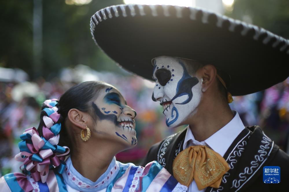 當日,墨西哥首都墨西哥城舉辦“卡特里娜游行”,迎接即將來(lái)臨的亡靈節。每年的11月1日和2日是墨西哥的傳統節日亡靈節。