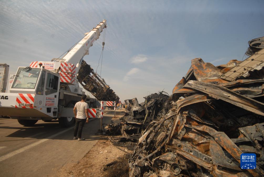 10月28日,工程車(chē)輛在埃及布海拉省的多車(chē)相撞事故現場(chǎng)清理路面上的損毀車(chē)輛。