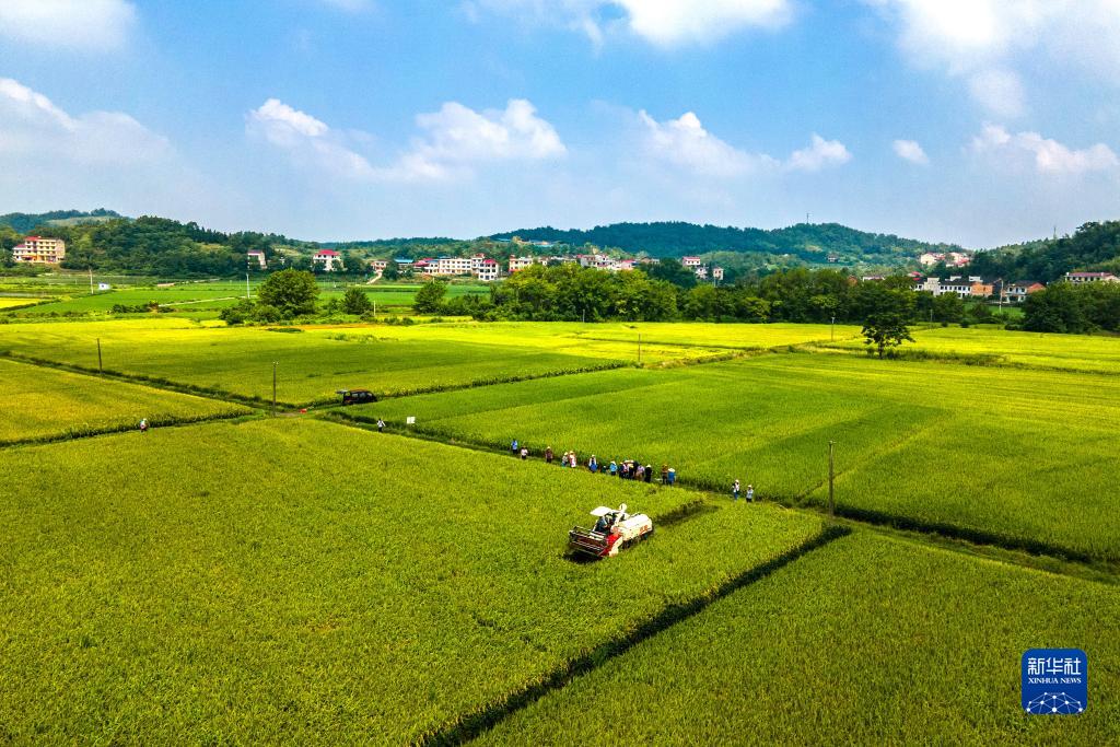 8月10日,在位于婁底市雙峰縣印塘鄉鹽井灣村的“稻再油”示范片,農機手駕駛收割機收割頭季稻谷(無(wú)人機照片)。