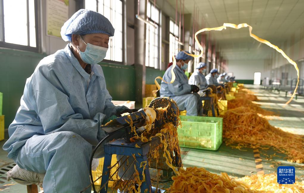 10月28日,村民在禹州市磨街鄉劉門(mén)村的加工廠(chǎng)里給柿子削皮,準備制作柿餅。