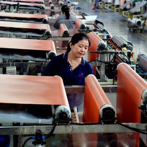 10月29日,在山東勁拓新材料科技有限公司,工作人員在導電布生產(chǎn)設備前值守。