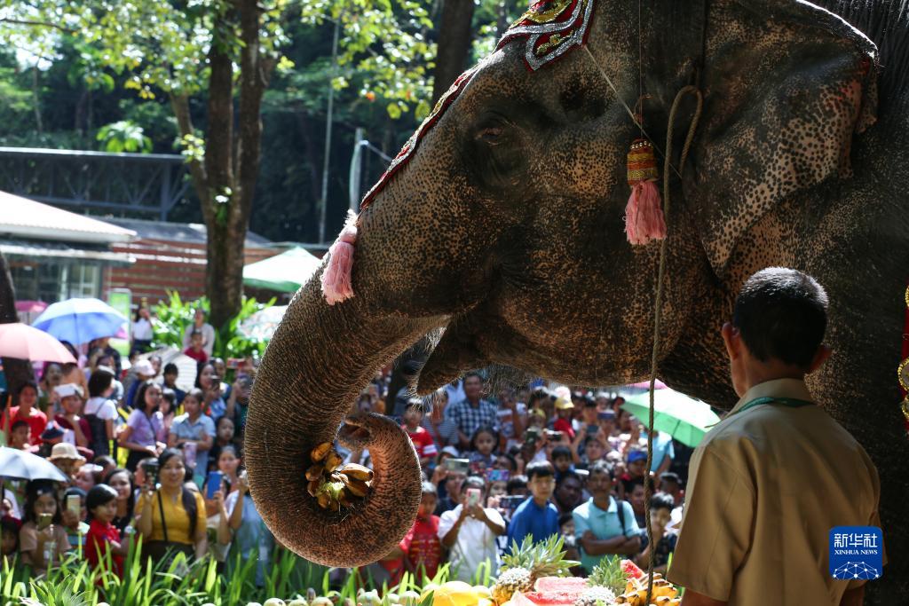 當日,雌性大象莫莫在緬甸仰光動(dòng)物園品嘗由水果和蔬菜制成的蛋糕,慶祝70歲生日。新華社發(fā)(苗覺(jué)梭攝)
